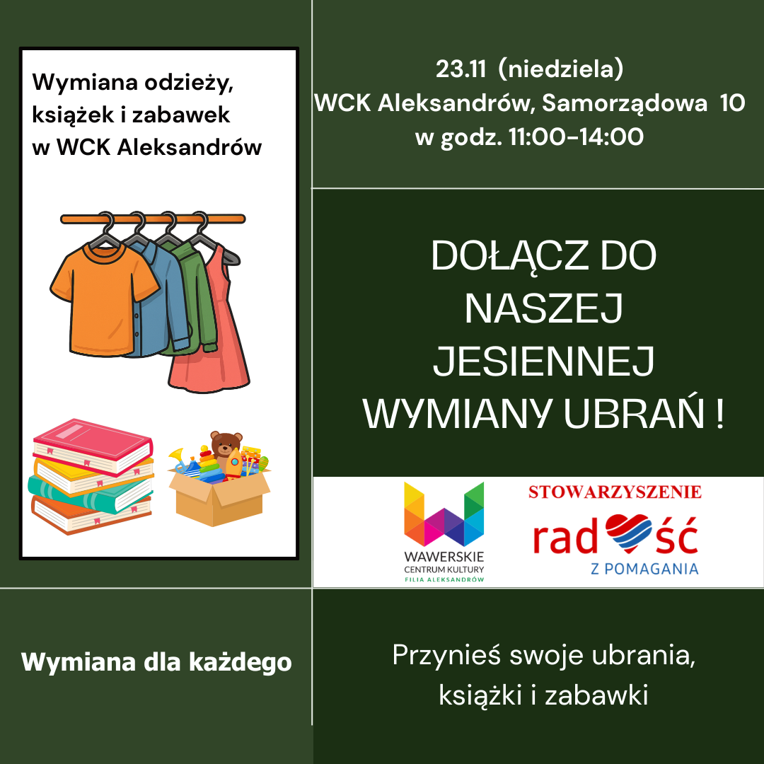 zrobić coś dobrego dla planety!Organizatorzy: WCK Aleksandrów oraz Stowarzyszenie Radość z pomaganiaPrzynieś, wymień, zabierz — i baw się dobrze!